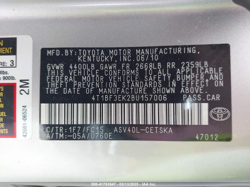2011 TOYOTA CAMRY 2011 Gasoline, 2.5, Front wheel drive, VIN - 4T1BF3EK2BU****** from the USA