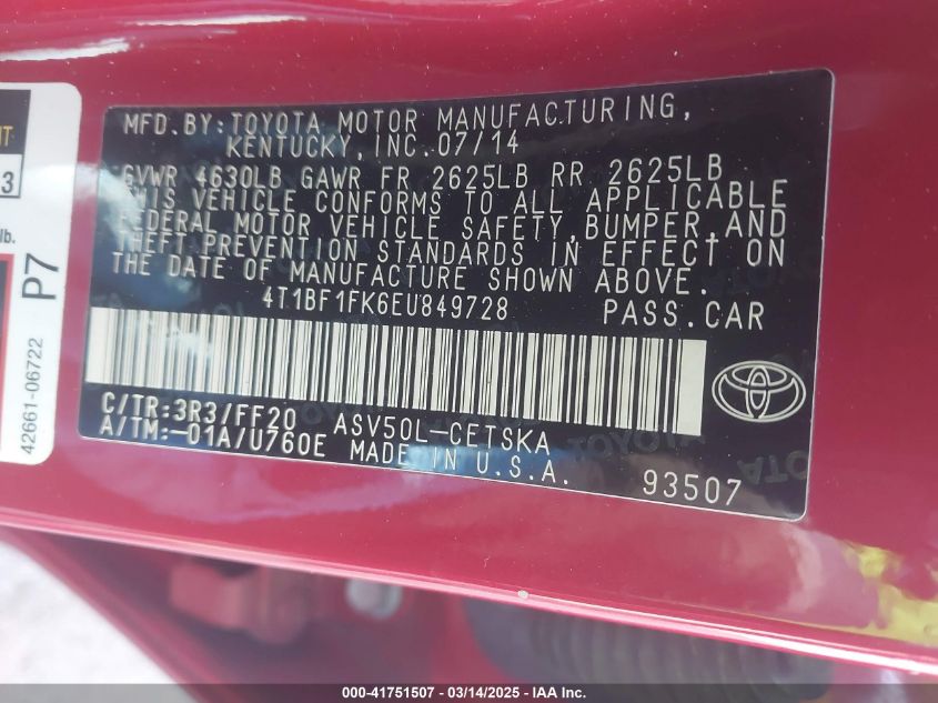 2014 TOYOTA CAMRY 2014 Gasoline, 2.5, Front wheel drive, VIN - 4T1BF1FK6EU****** from the USA
