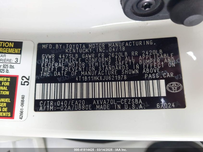2018 TOYOTA CAMRY 2018 Gasoline, 2.5, Front wheel drive, VIN - 4T1B11HKXJU****** from the USA