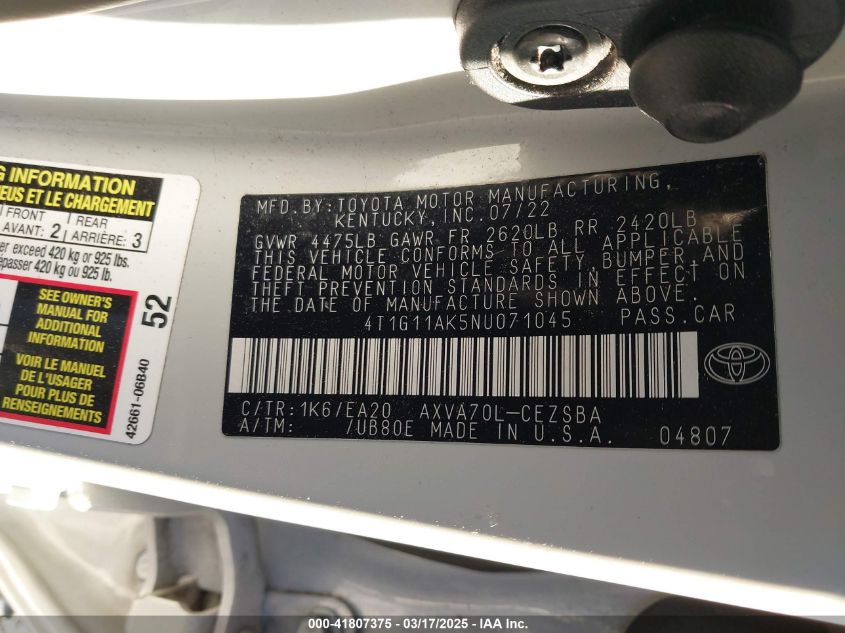 Color WhiteCylinders 4Drive Front wheel driveVIN 4T1G11AK5NU******State Run & Drive VerifiedDamage Back AutoRIA