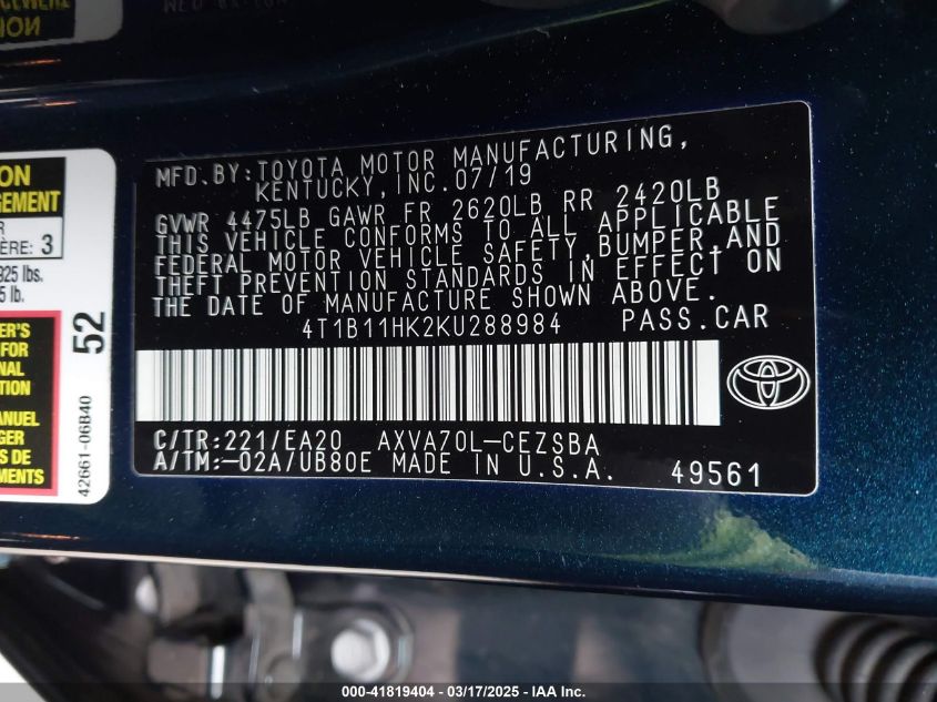 2019 TOYOTA CAMRY 2019 Gasoline, 2.5, Front wheel drive, VIN - 4T1B11HK2KU****** from the USA