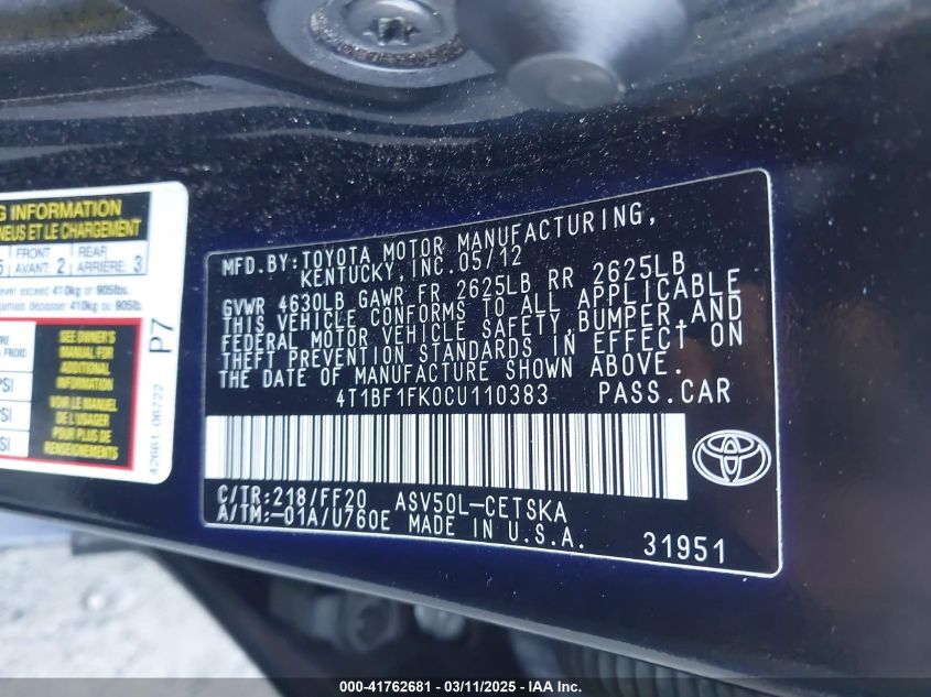 2012 TOYOTA CAMRY 2012 Gasoline, 2.5, Front wheel drive, VIN - 4T1BF1FK0CU****** from the USA