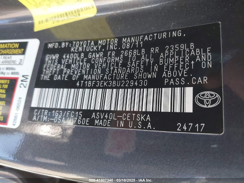 Color GrayCylinders 4Drive Front wheel driveVIN 4T1BF3EK3BU******State Run & Drive VerifiedDamage Front or back AutoRIA