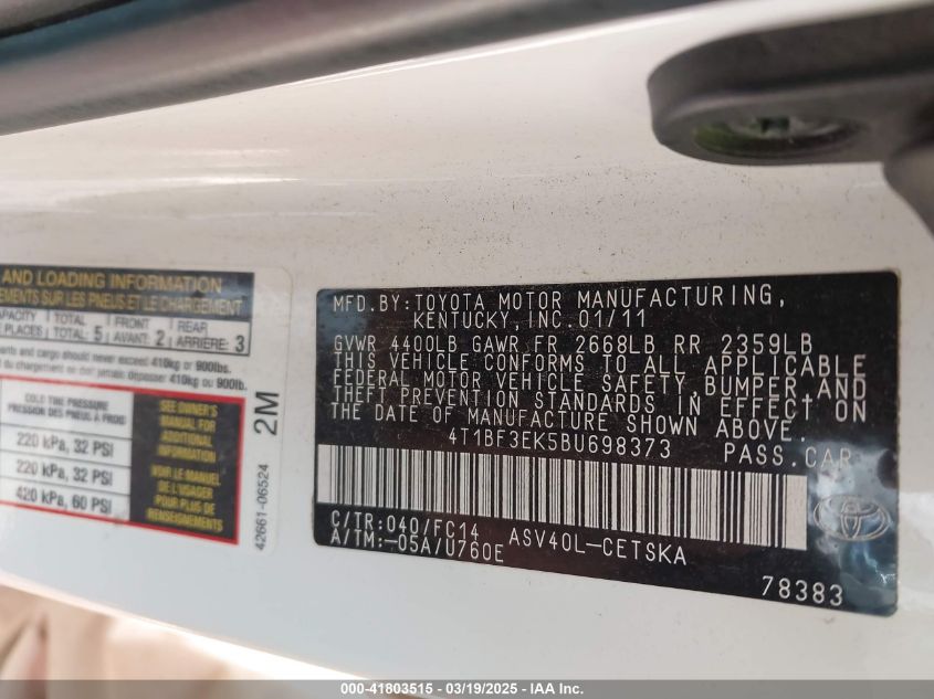2011 TOYOTA CAMRY 2011 Gasoline, 2.5, Front wheel drive, VIN - 4T1BF3EK5BU****** from the USA