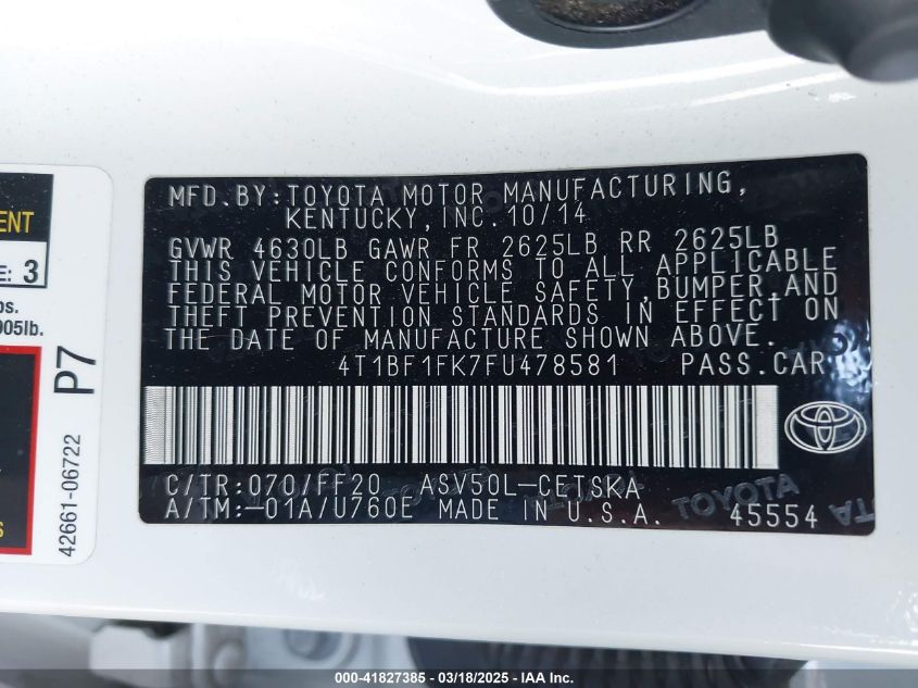 2015 TOYOTA CAMRY 2015 Gasoline, 2.5, Front wheel drive, VIN - 4T1BF1FK7FU****** from the USA