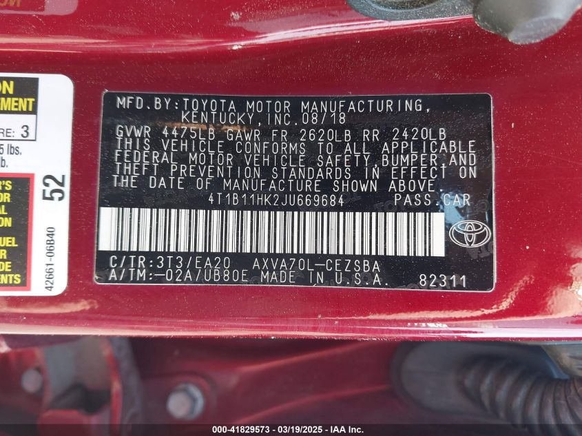 2018 TOYOTA CAMRY 2018 Gasoline, 2.5, Front wheel drive, VIN - 4T1B11HK2JU****** from the USA