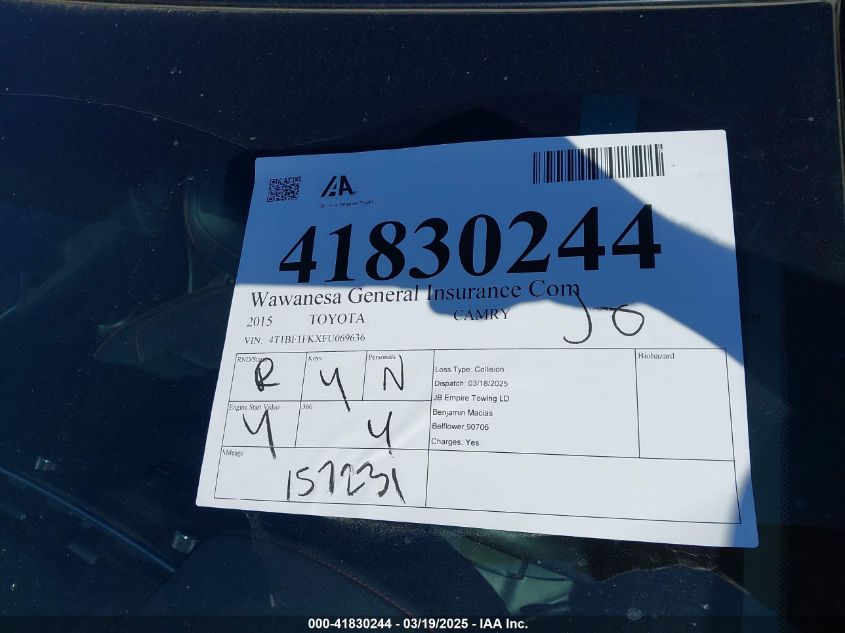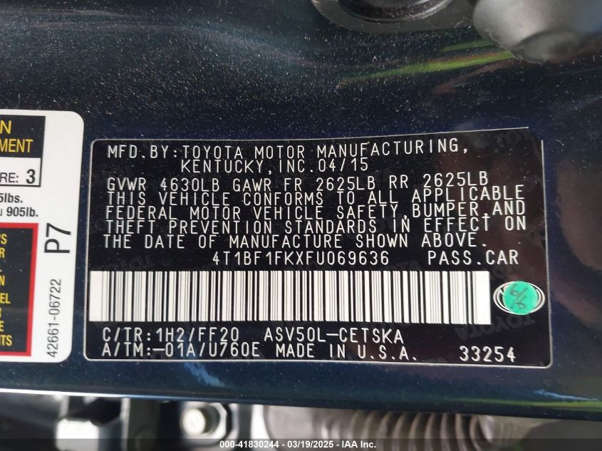 2015 TOYOTA CAMRY 2015 Gasoline, 2.5, Front wheel drive, VIN - 4T1BF1FKXFU****** from the USA