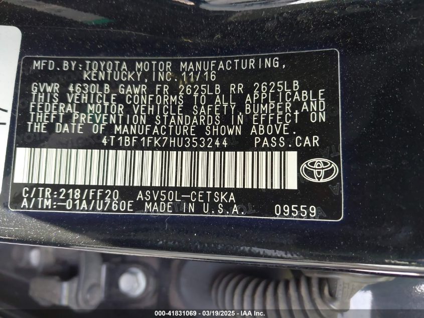 2017 TOYOTA CAMRY 2017 Gasoline, 2.5, Front wheel drive, VIN - 4T1BF1FK7HU****** from the USA