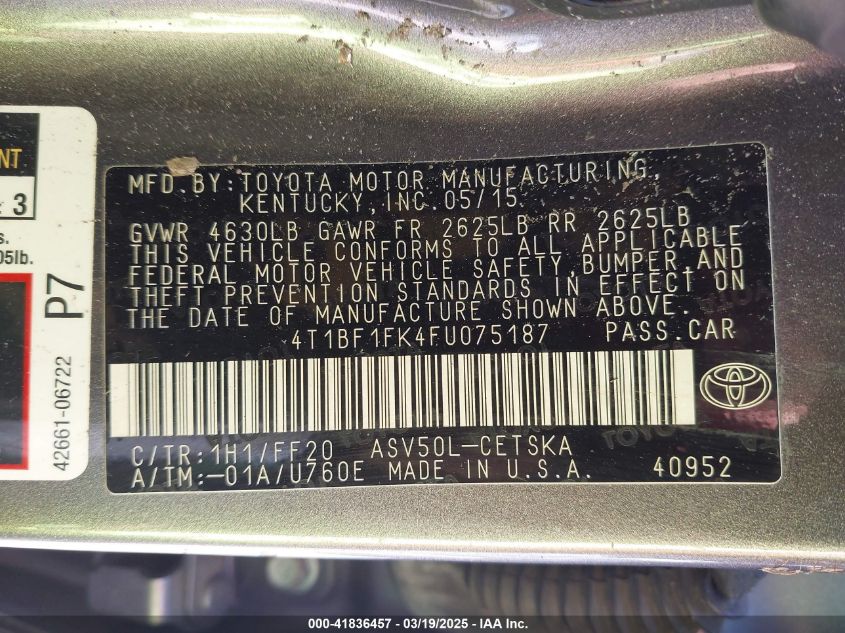 2015 TOYOTA CAMRY 2015 Gasoline, 2.5, Front wheel drive, VIN - 4T1BF1FK4FU****** from the USA