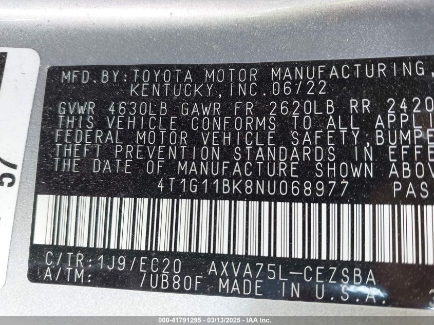 Color SilverCylinders 4Drive Full driveVIN 4T1G11BK8NU******State Run & Drive VerifiedDamage Front or back AutoRIA