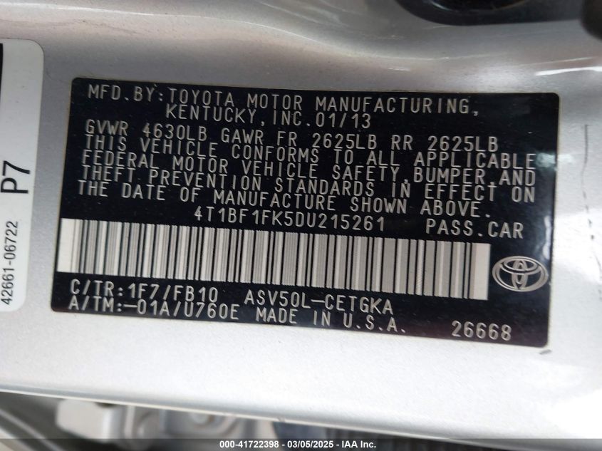 Color SilverCylinders 4Drive Front wheel driveVIN 4T1BF1FK5DU******State Run & Drive VerifiedDamage Front or back AutoRIA