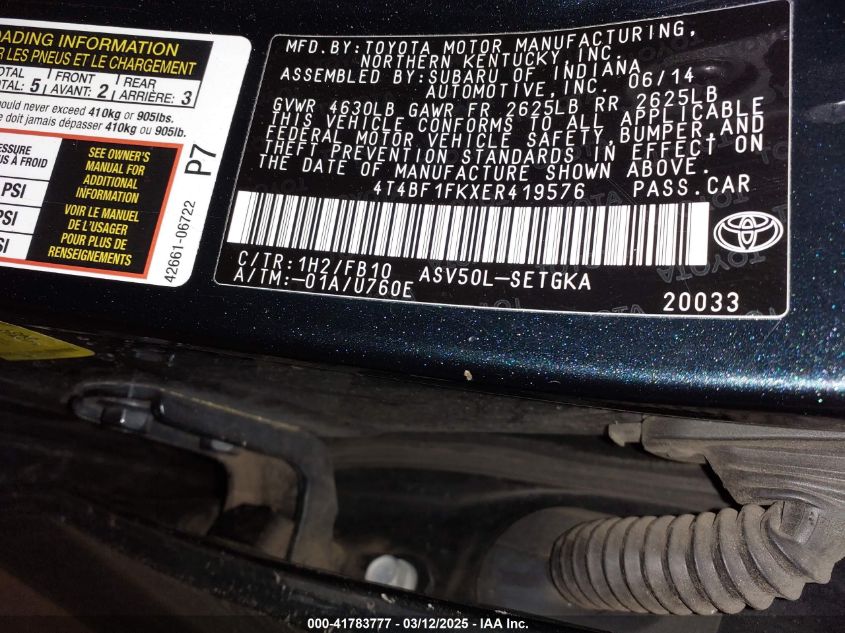 Color BlackCylinders 4Drive Front wheel driveVIN 4T4BF1FKXER******State Run & Drive VerifiedDamage Front right AutoRIA