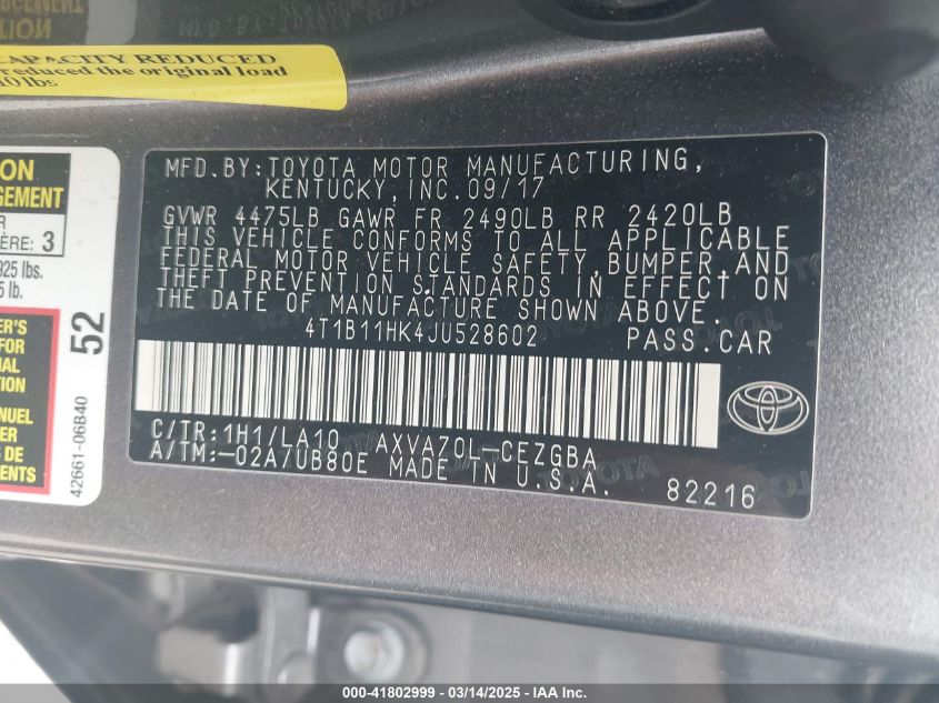 2018 TOYOTA CAMRY 2018 Gasoline, 2.5, Front wheel drive, VIN - 4T1B11HK4JU****** from the USA