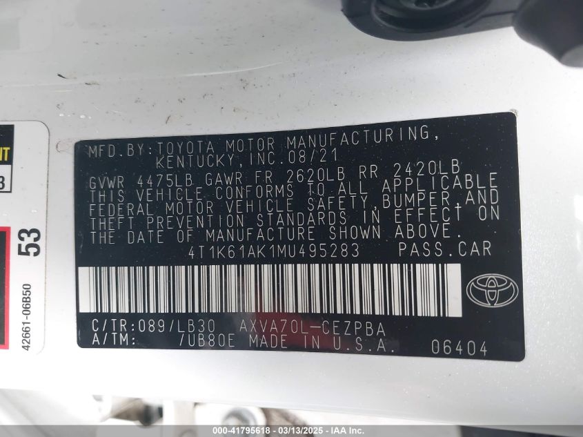 2021 TOYOTA CAMRY 2021 Gasoline, 2.5, Front wheel drive, VIN - 4T1K61AK1MU****** from the USA