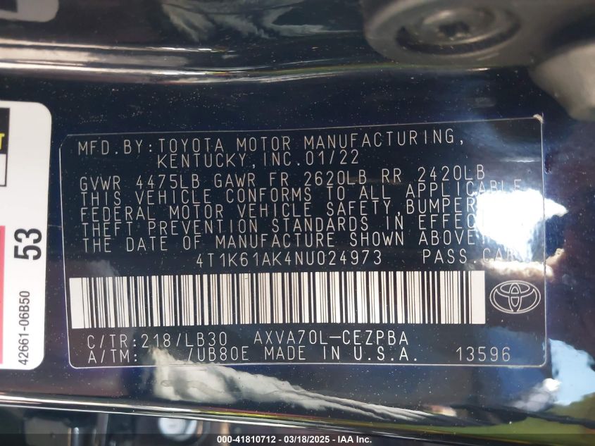 2022 TOYOTA CAMRY 2022 Gasoline, 2.5, Front wheel drive, VIN - 4T1K61AK4NU****** from the USA