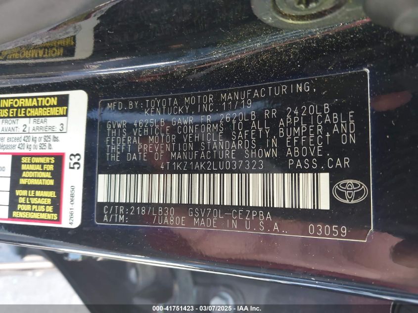 2020 TOYOTA CAMRY 2020 Gasoline, 3.5, Front wheel drive, VIN - 4T1KZ1AK2LU****** from the USA