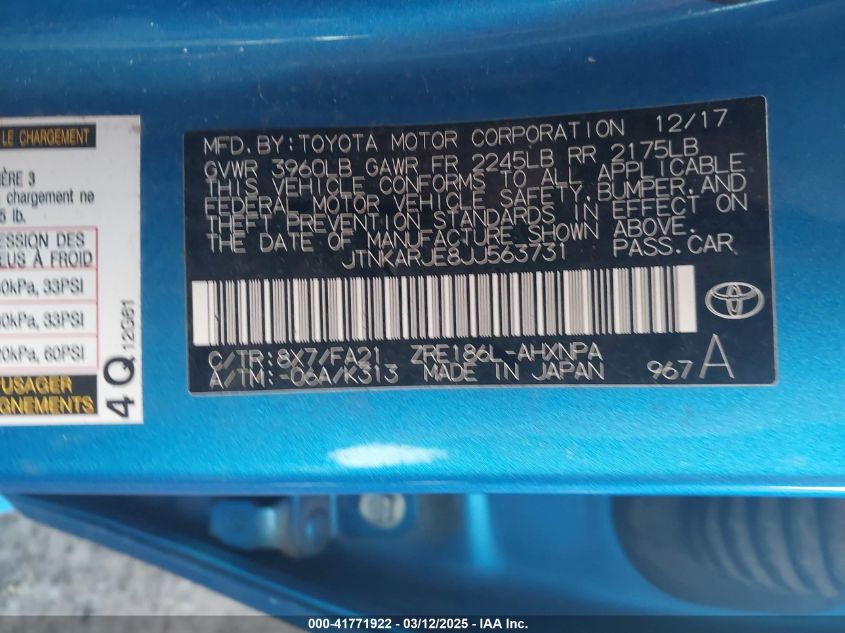 Color BlueCylinders 4Drive Front wheel driveVIN JTNKARJE8JJ******State Run & Drive VerifiedDamage Back AutoRIA