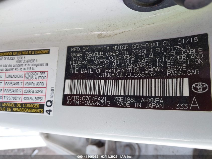 Color WhiteCylinders 4Drive Front wheel driveVIN JTNKARJE7JJ******State Run & Drive VerifiedDamage Front left AutoRIA