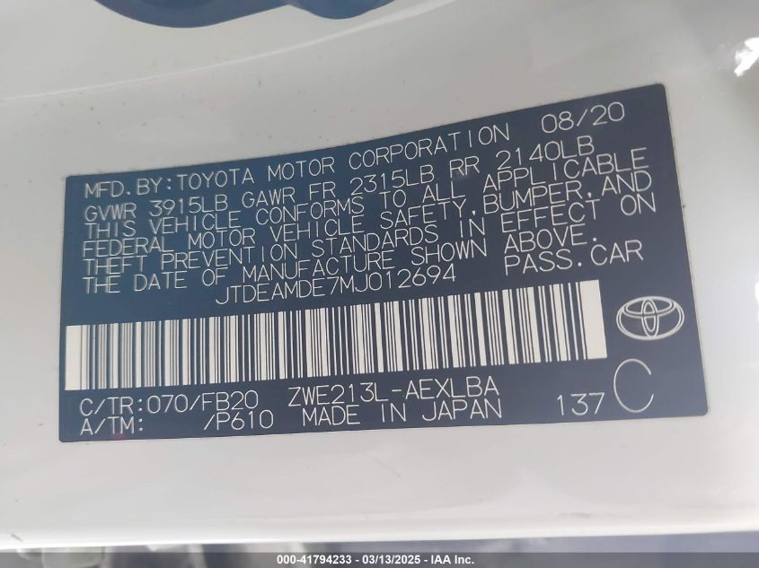 2021 TOYOTA COROLLA 2021 Hybrid, 1.8, Front wheel drive, VIN - JTDEAMDE7MJ****** from the USA