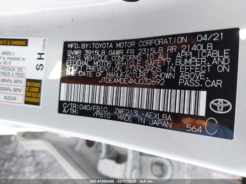2021 TOYOTA COROLLA 2021 Hybrid, 1.8, Front wheel drive, VIN - JTDEAMDE4MJ****** from the USA