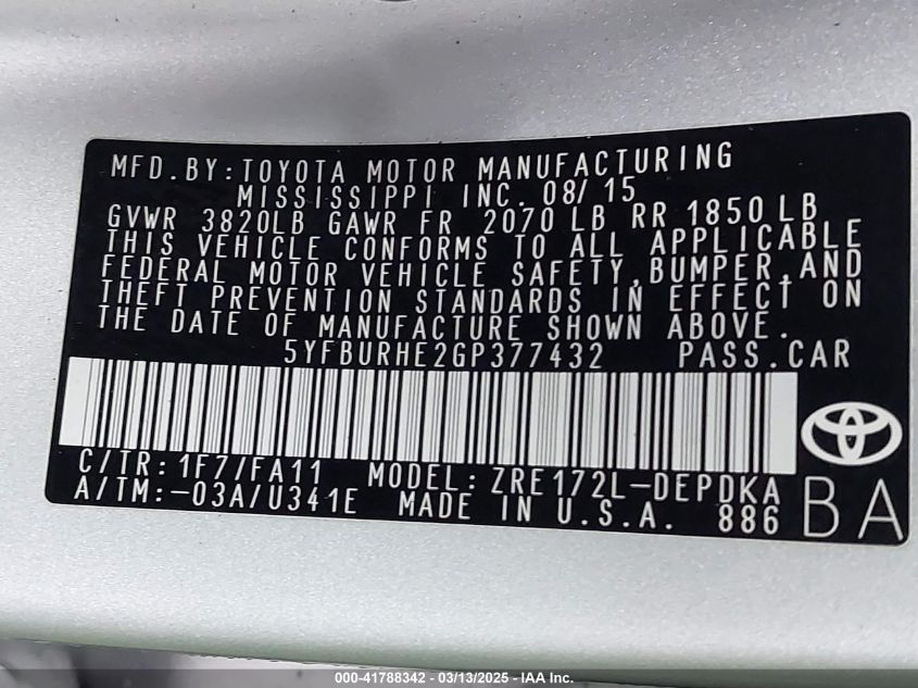2016 TOYOTA COROLLA 2016 Gasoline, 1.8, Front wheel drive, VIN - 5YFBURHE2GP****** from the USA