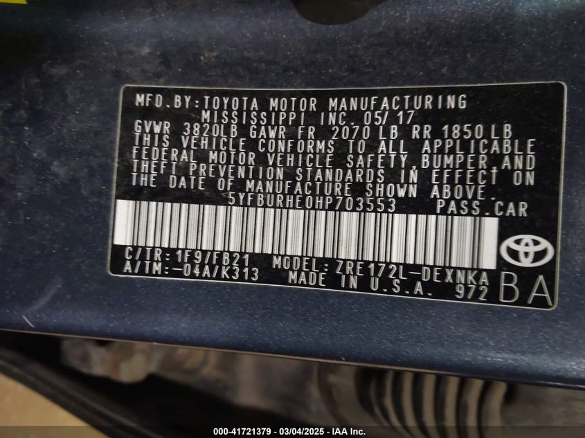 2017 TOYOTA COROLLA 2017 Gasoline, 1.8, Front wheel drive, VIN - 5YFBURHE0HP****** from the USA