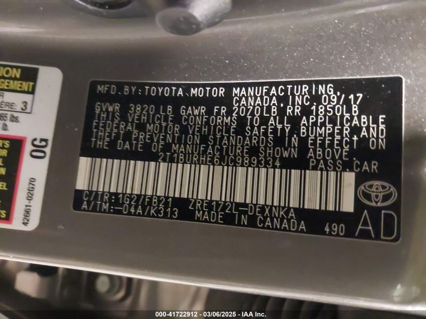2018 TOYOTA COROLLA 2018 Gasoline, 1.8, Front wheel drive, VIN - 2T1BURHE6JC****** from the USA