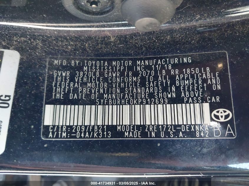 2019 TOYOTA COROLLA 2019 Gasoline, 1.8, Front wheel drive, VIN - 5YFBURHE0KP****** from the USA