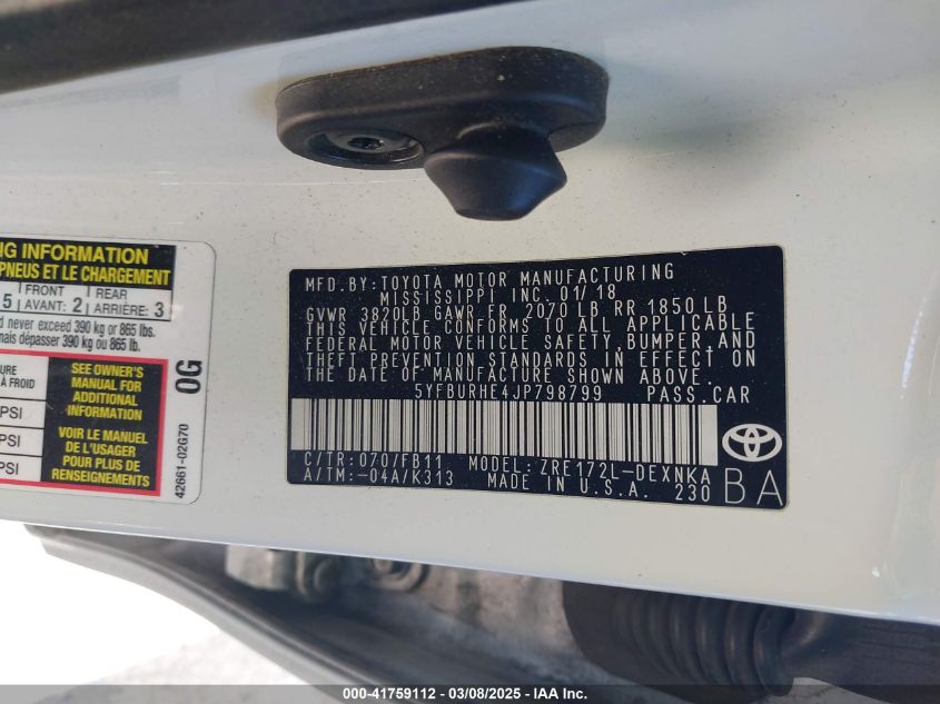 2018 TOYOTA COROLLA 2018 Gasoline, 1.8, Front wheel drive, VIN - 5YFBURHE4JP****** from the USA