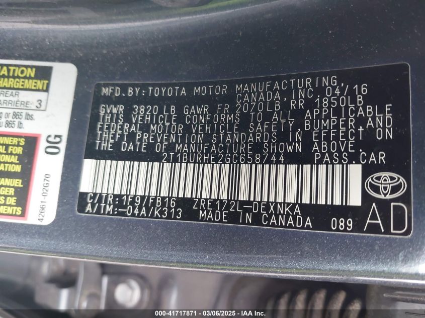 2016 TOYOTA COROLLA 2016 Gasoline, 1.8, Front wheel drive, VIN - 2T1BURHE2GC****** from the USA