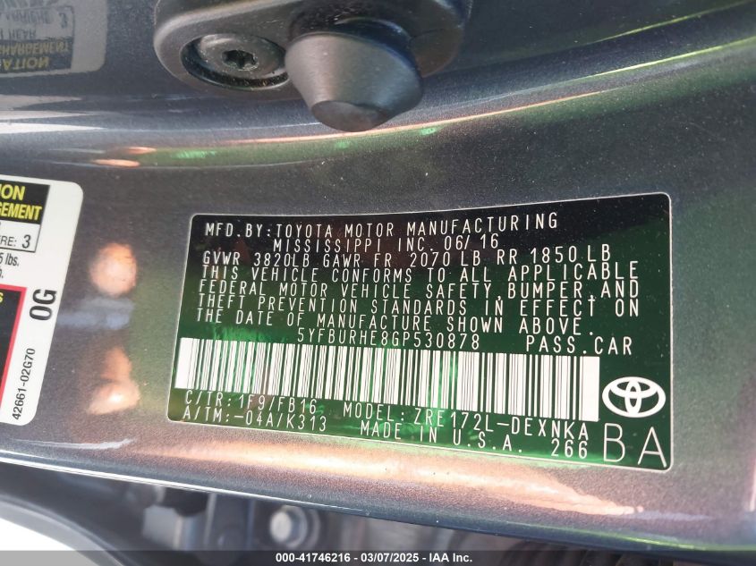 2016 TOYOTA COROLLA 2016 Gasoline, 1.8, Front wheel drive, VIN - 5YFBURHE8GP****** from the USA