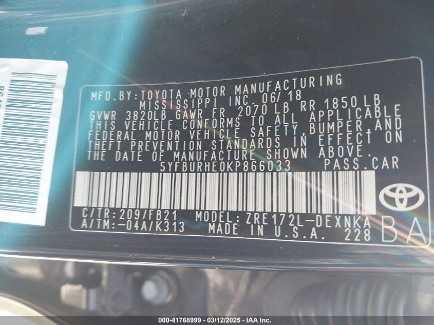 2019 TOYOTA COROLLA 2019 Gasoline, 1.8, Front wheel drive, VIN - 5YFBURHE0KP****** from the USA