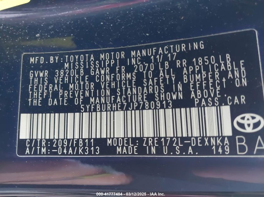2018 TOYOTA COROLLA 2018 Gasoline, 1.8, Front wheel drive, VIN - 5YFBURHE7JP****** from the USA