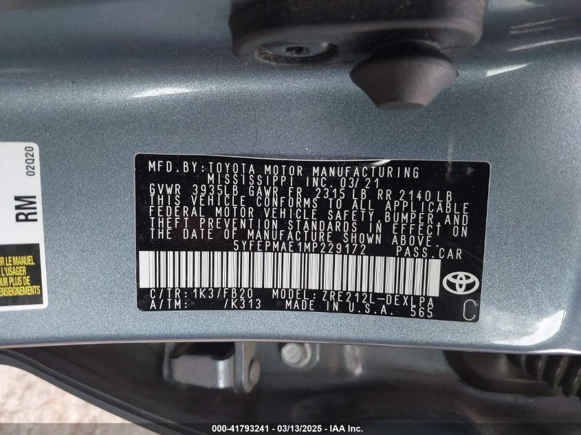2021 TOYOTA COROLLA 2021 Gasoline, 1.8, Front wheel drive, VIN - 5YFEPMAE1MP****** from the USA