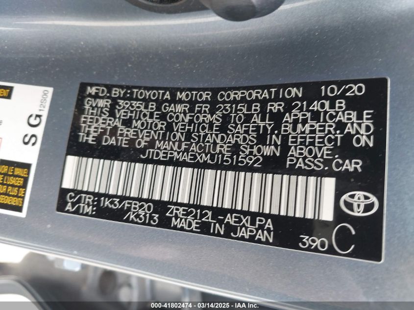 2021 TOYOTA COROLLA 2021 Gasoline, 1.8, Front wheel drive, VIN - JTDEPMAEXMJ****** from the USA