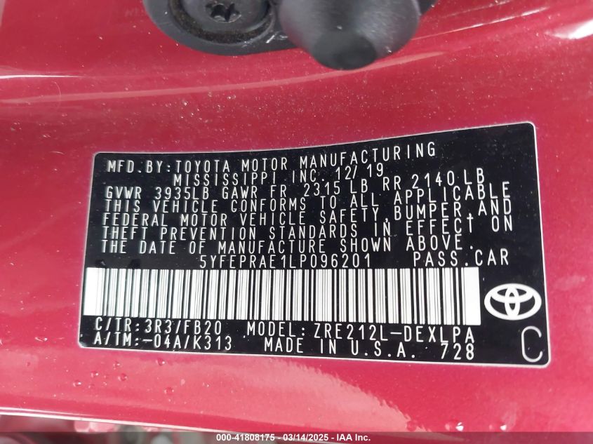 2020 TOYOTA COROLLA 2020 Gasoline, 1.8, Front wheel drive, VIN - 5YFEPRAE1LP****** from the USA