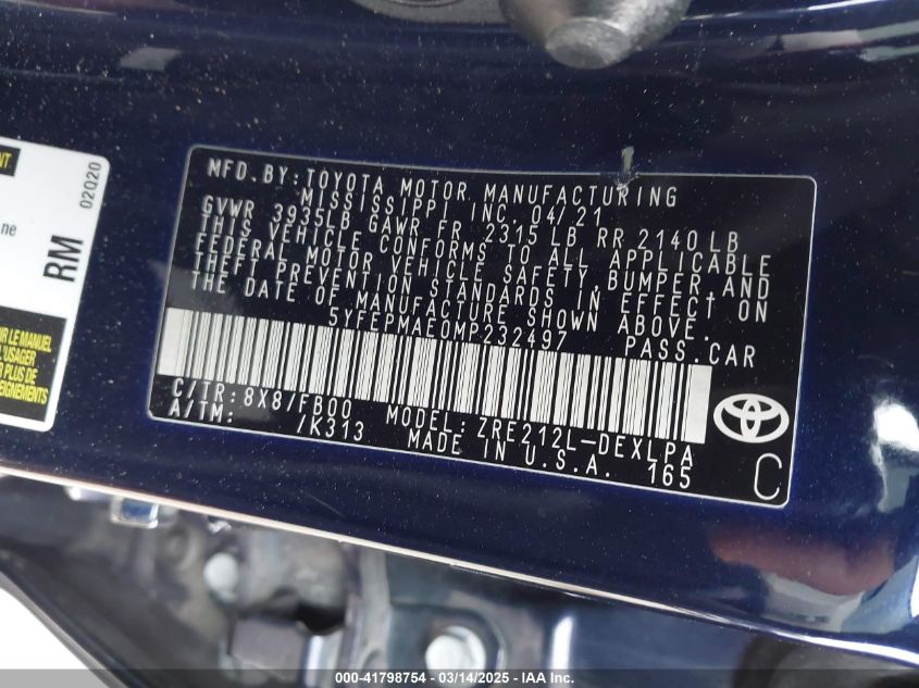 2021 TOYOTA COROLLA 2021 Gasoline, 1.8, Front wheel drive, VIN - 5YFEPMAE0MP****** from the USA