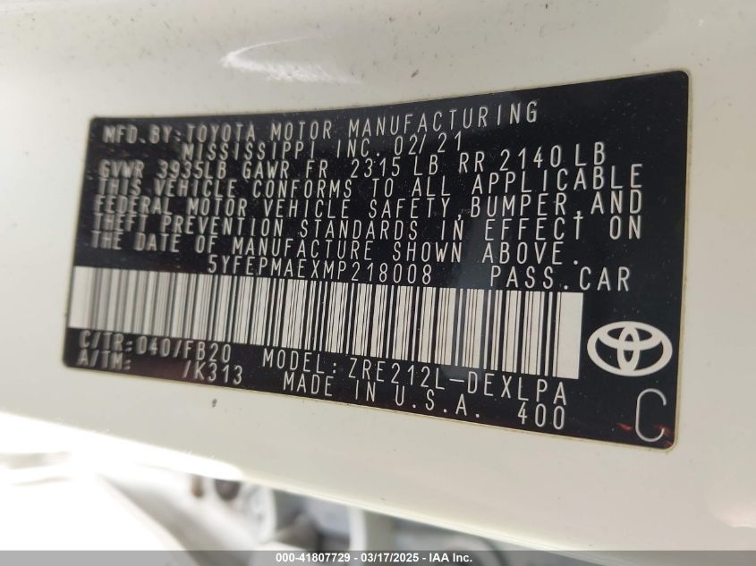 2021 TOYOTA COROLLA 2021 Gasoline, 1.8, Front wheel drive, VIN - 5YFEPMAEXMP****** from the USA