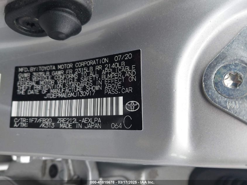 2021 TOYOTA COROLLA 2021 Gasoline, 1.8, Front wheel drive, VIN - JTDEPMAE6MJ****** from the USA