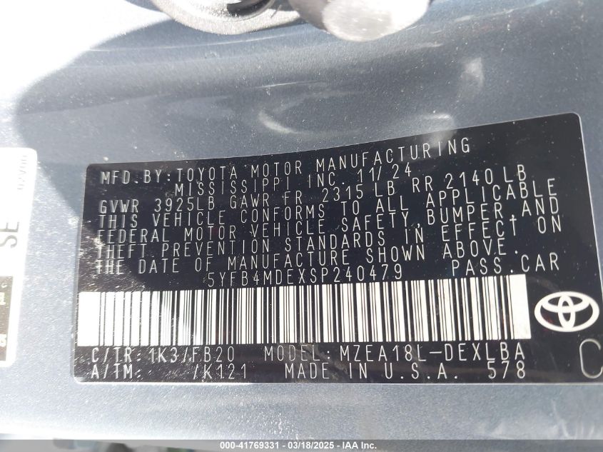 2025 TOYOTA COROLLA 2025 Gasoline, 2.0, Front wheel drive, VIN - 5YFB4MDEXSP****** from the USA