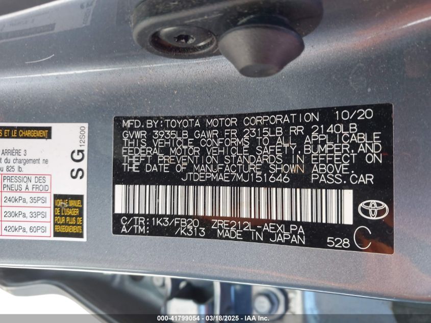 2021 TOYOTA COROLLA 2021 Gasoline, 1.8, Front wheel drive, VIN - JTDEPMAE7MJ****** from the USA