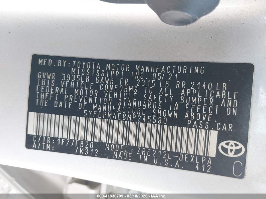 2021 TOYOTA COROLLA 2021 Gasoline, 1.8, Front wheel drive, VIN - 5YFEPMAE8MP****** from the USA