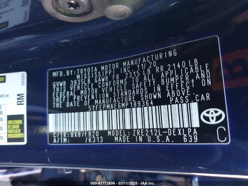 2021 TOYOTA COROLLA 2021 Gasoline, 1.8, Front wheel drive, VIN - 5YFEPMAE6MP****** from the USA