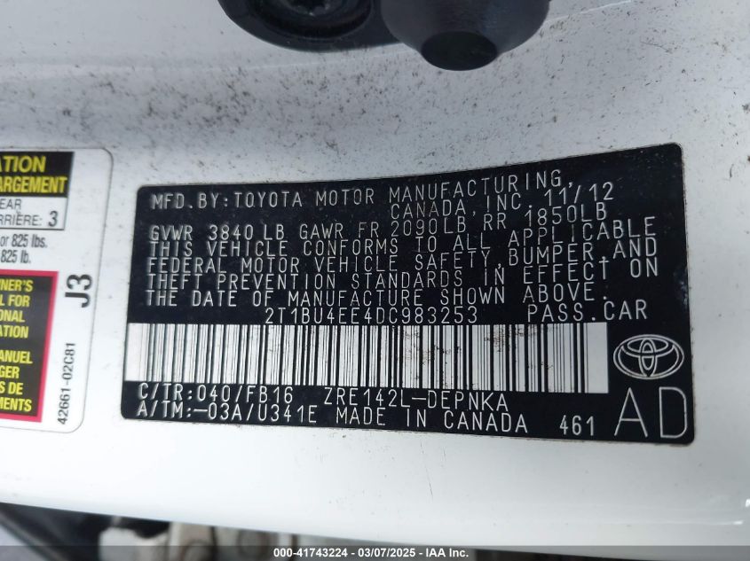 2013 TOYOTA COROLLA 2013 Gasoline, 1.8, Front wheel drive, VIN - 2T1BU4EE4DC****** from the USA
