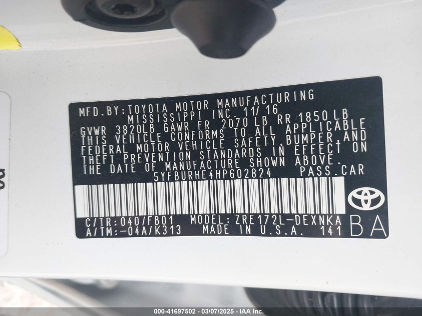 2017 TOYOTA COROLLA 2017 Gasoline, 1.8, Front wheel drive, VIN - 5YFBURHE4HP****** from the USA