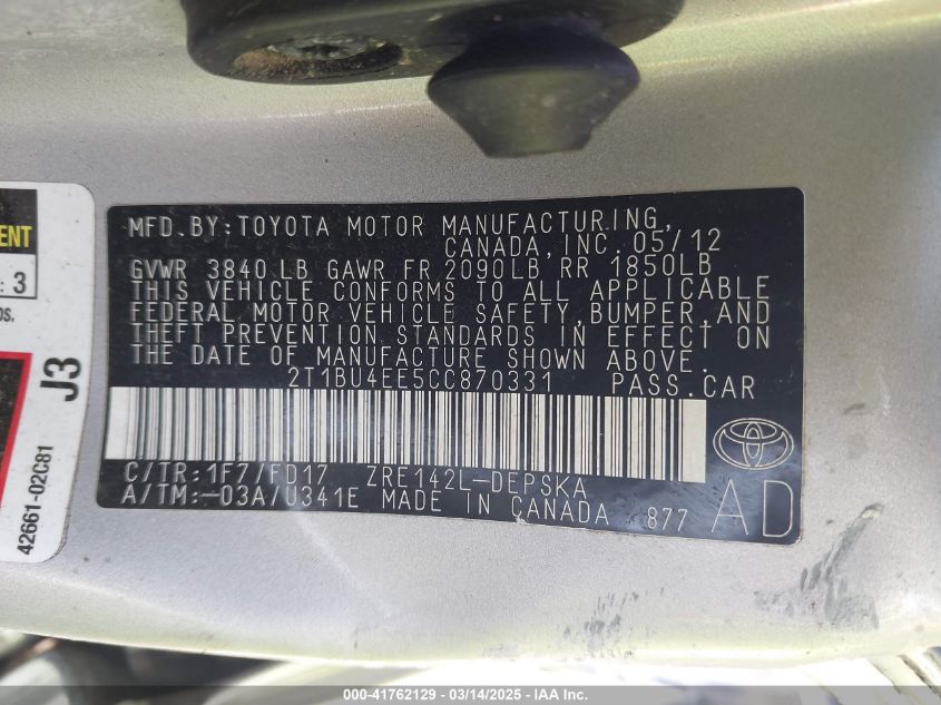 2012 TOYOTA COROLLA 2012 Gasoline, 1.8, Front wheel drive, VIN - 2T1BU4EE5CC****** from the USA