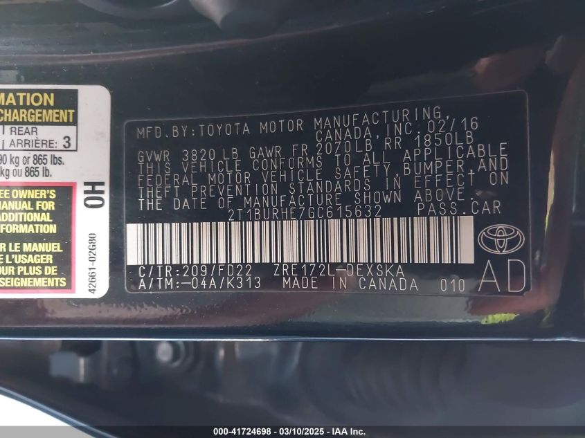 2016 TOYOTA COROLLA 2016 Gasoline, 1.8, Front wheel drive, VIN - 2T1BURHE7GC****** from the USA