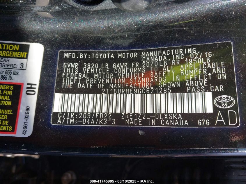 2016 TOYOTA COROLLA 2016 Gasoline, 1.8, Front wheel drive, VIN - 2T1BURHE9GC****** from the USA