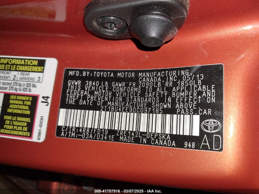 2013 TOYOTA COROLLA 2013 Gasoline, 1.8, Front wheel drive, VIN - 2T1BU4EE9DC****** from the USA