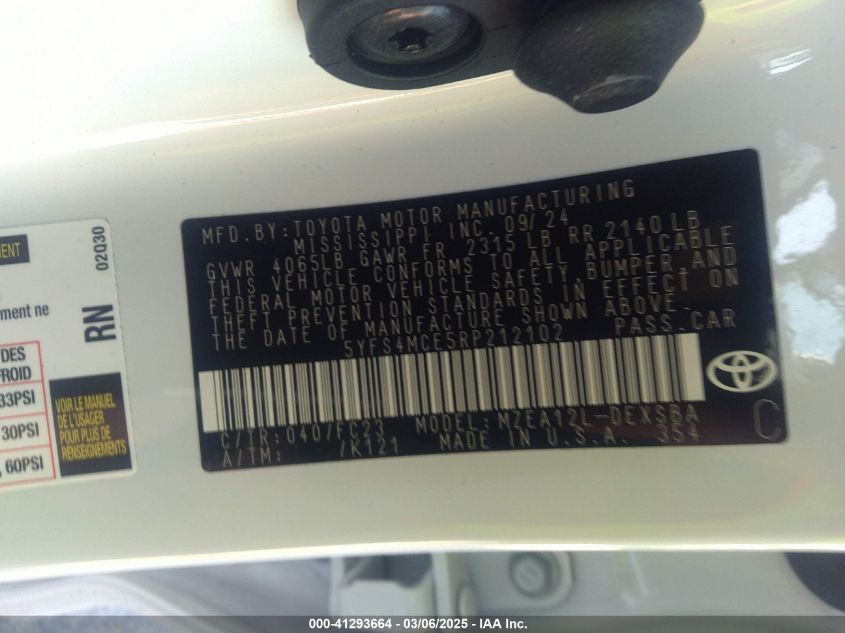 2024 TOYOTA COROLLA 2024 Gasoline, 2.0, Front wheel drive, VIN - 5YFS4MCE5RP****** from the USA